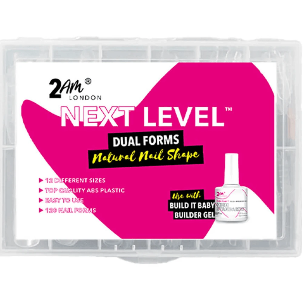 Whether you are building strength or wanting to reach new lengths, the 2AM London Next Level Dual Forms are the perfect assist to achieve sculpted, lightweight nail enhancements. Made from top quality ABS plastic, each box contains 12 different sizes in a natural nail shape. Use alongside the 2AM London Clear Brush-On Builder Gel and pop that form! 120 nail forms per box.
