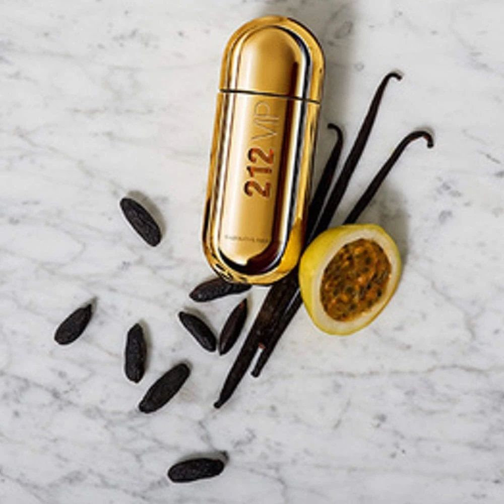 212 VIP Are you on the list? – The New Feminine fragrance by Carolina Herrera. A dazzling floriental explosion, sensual and sparkling with top notes of Bergamot, a delicious heart of flowers and a sensual base of vanilla and musk. Truly glamorous, fresh and alluring enclosed in a dazzling gold bottle.