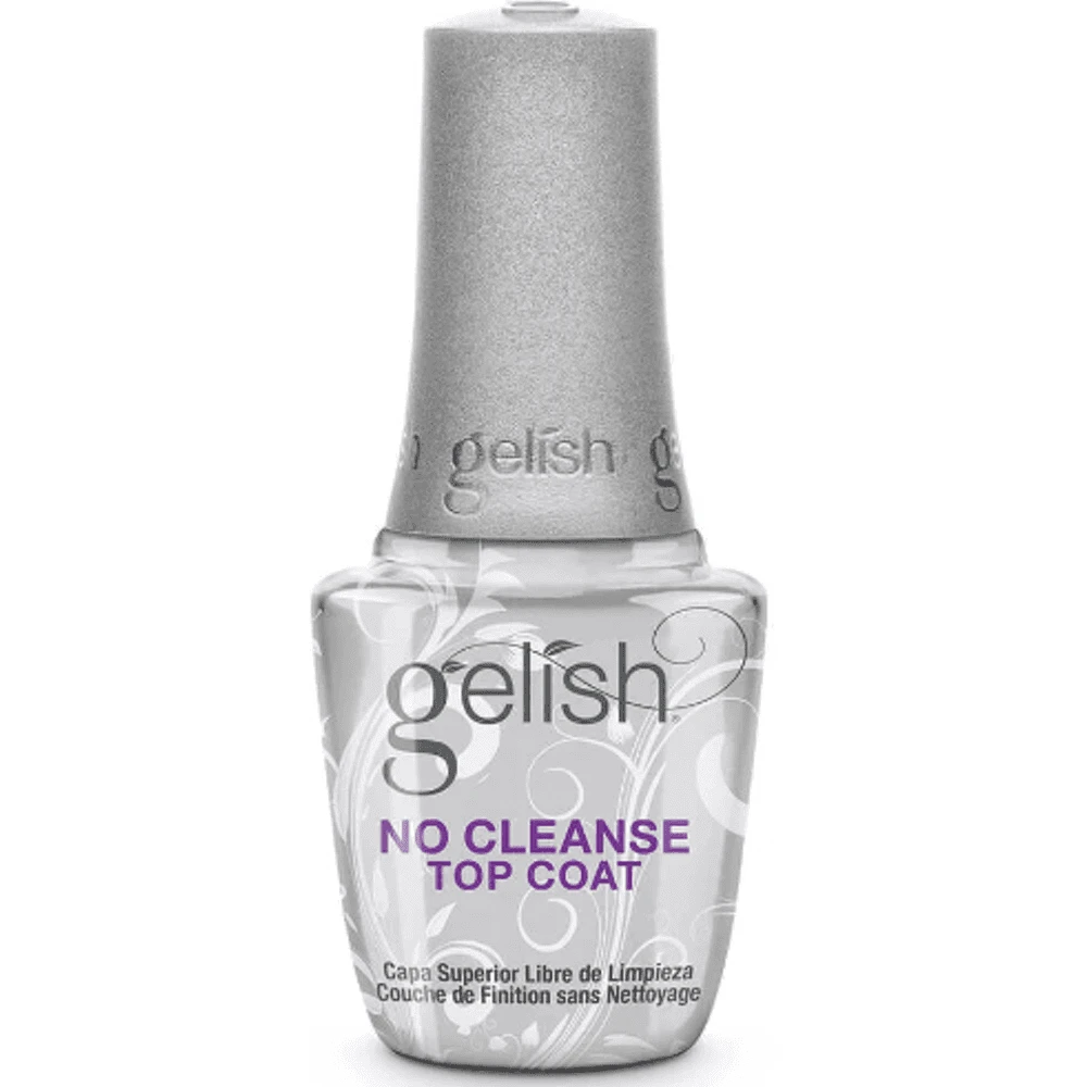Gelish® No Cleanse Gel Top Coat is a universal top coat that can be used over gel polish, acrylics, polygel and hard gels. Gelish No Cleanse Top Coat Cures in 60 seconds with a high gloss shine, while saving time as there’s no need to wipe the tacky layer off after curing!
