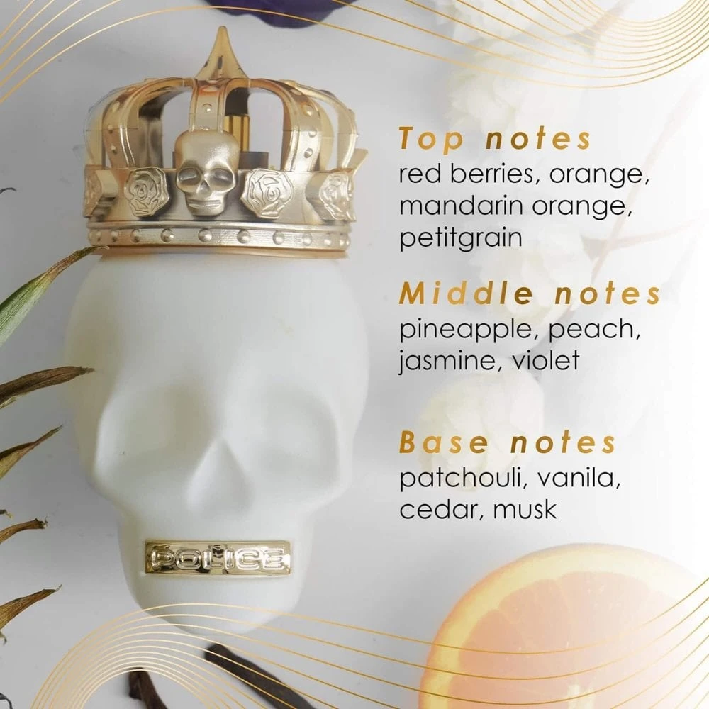 Police To Be The Queen an air of excitement, explosiveness and euphoria, with top notes of orange, mandarin and petitgrain with the aroma of red berries, and the added sensualtiy of jasmine blossom and violet. Giving a warm juicy sweetness to the fragrance with the depth and warmth of musk, cedar and patchouli.