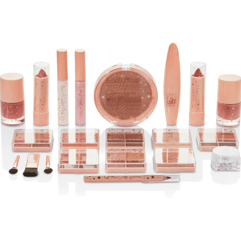 Q-KI Superstar Collection 4 x 4.2g Eyeshadow, 4g Blusher, 4g Bronzer, 4g Highlighter, 17g Baked Blusher, 2.2g Lipstick-Godet, 4ml Liquid Highlighter, 4ml Holographic Lip Topper, 2 x 3.3g Lipstick, 2 x 8ml Nail Polish, 5.5ml Mascara, 0.8g Brow Pencil, 0.5g Gems, 2 x Eyeshadow Applicator, Makeup Brush